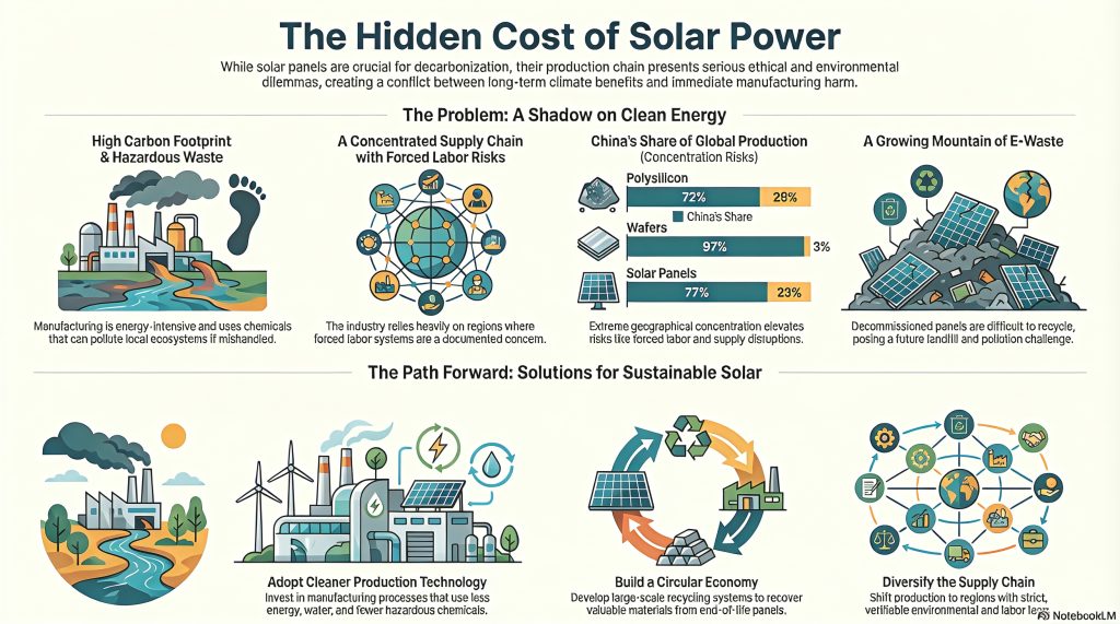 این سند یک گزارش از دانشگاه علوم کاربردی FH تکنیکوم وین است که یک معضل اخلاقی پیرامون تولید فتوولتائیک (PV) یا پنلهای خورشیدی را بررسی میکند. این گزارش با ارائه یک نمای کلی از فرآیند تولید سلولهای سیلیکون کریستالی آغاز میشود که شامل استخراج، تصفیه سیلیس و مونتاژ نهایی ماژول است. تمرکز اصلی بر روی آسیبهای زیستمحیطی مرتبط با ساخت PV است، از جمله ردپای کربن بالا به دلیل مصرف انرژی زیاد، تولید مواد شیمیایی خطرناک و چالشهای بازیافت در پایان عمر مفید پنلها. علاوه بر این، این مقاله مسائل کارگری، به ویژه خطر استفاده از کار اجباری در زنجیره تأمین متمرکز در چین، را برجسته میکند. در نهایت، این گزارش با ارزیابی این معضل از دو دیدگاه اصلی اخلاقی—فایدهگرایی (نتیجهگرایی) که منافع بلندمدت انرژی پاک را در اولویت قرار میدهد و وظیفهگرایی (اخلاق مبتنی بر وظیفه) که اصرار بر رعایت اصول اخلاقی در تولید دارد—به پایان میرسد.