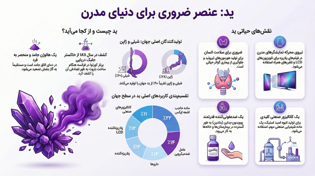 این عنصر که برای اولین بار در سال ۱۸۱۱ توسط شیمیدانی به نام برنار کورتوا از خاکستر جلبک دریایی کشف شد، بسیار فراتر از یک نام ترسناک در اخبار است. ید یک قهرمان پنهان در دنیای مدرن است که در فناوری، سلامت و ایمنی ما نقشهای حیاتی ایفا میکند. بیایید با هم سفری را برای کشف کاربردهای باورنکردنی این عنصر در محصولات روزمره آغاز کنیم.