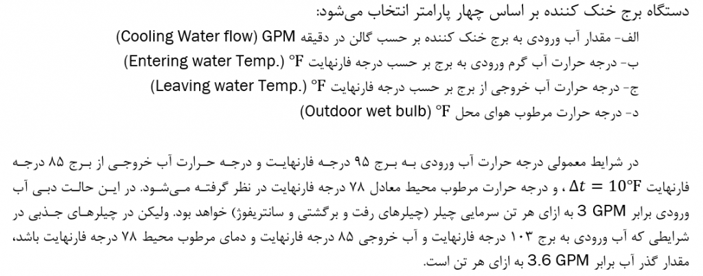 ظرفيت برج هاي خنک کننده در صنعت بر اساس تن تعريف مي شود که در اين حالت يک تن سرمايي برج خنککننده معادل 15000 btu در ساعت، حرارتي است که برج به محيط اطراف انتقال مي دهد.