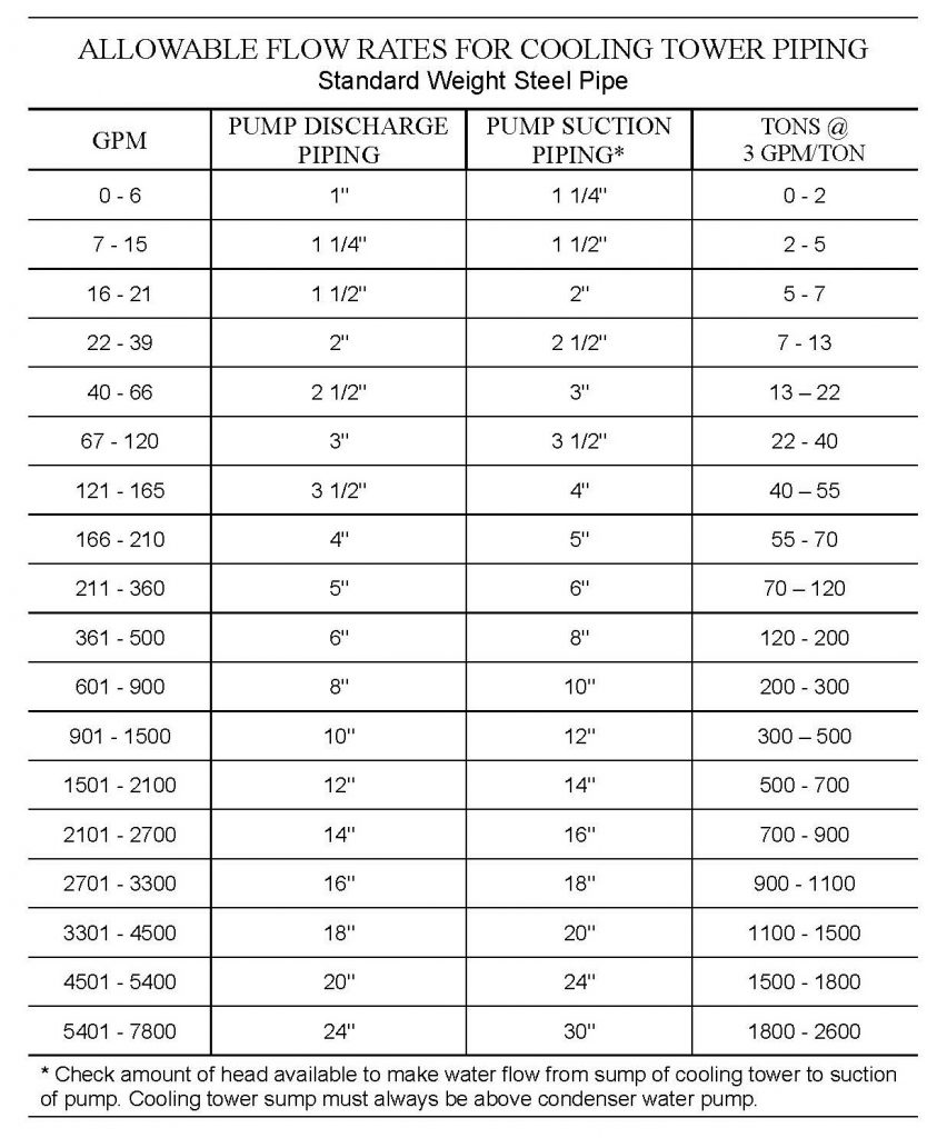 مقدار دبي مجاز در مدار لوله کشي برج خنک کننده را مي توان از جدول زير محاسبه نمود.