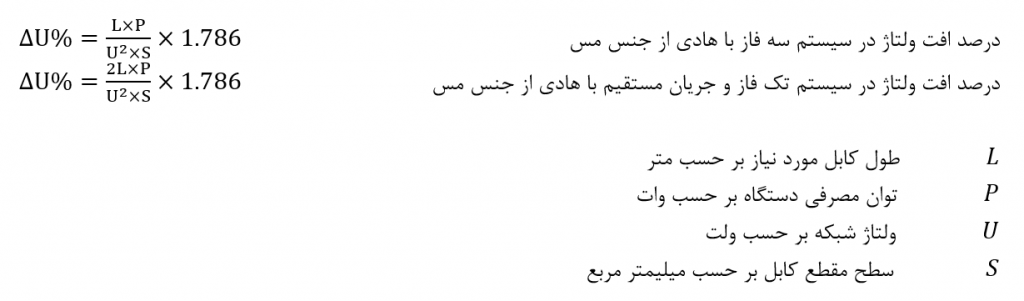 اگر در مرحله قبل کابلي با سطح مقطع S انتخاب کرده باشيم. ميتوان درصد افت ولتاژ را از رابطه زير محاسبه نمود: