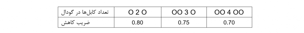 جريان مجاز داده شده در جداول مشخصات کابلها با در نظر گرفتن دماي محيط 25 درجه سانتيگراد بوده است. همچنين فرض شده در هر کانال فقط يک کابل بکار رفته باشد. اگر شرايط خاص کار متفاوت با شرايط فوق باشد ميتوان از رابطه زير جريان مجاز واقعي کابل را محاسبه کرد: