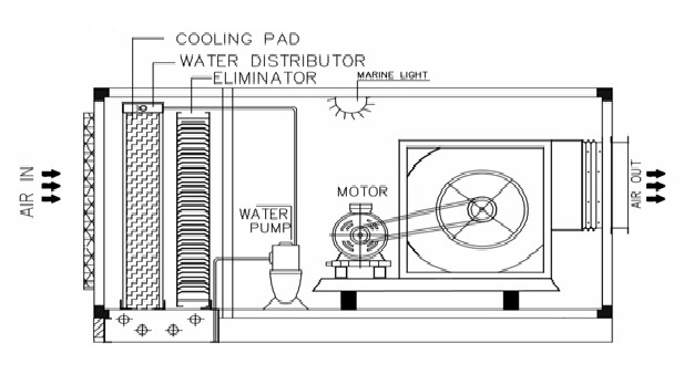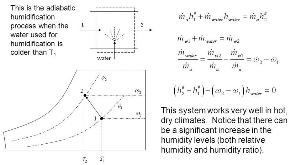 با توجه به اينكه در داخل دستگاه آب پودر شده و در هوا بصورت بخار آب ظاهر ميگردد، آب گرماي لازم جهت تبخيرشدن را از هوا ميگيرد و در نتيجه درجه حرارت هوا پايين ميآيد و رطوبت آن بالا ميرود و حرارت محسوس هوا Sensible heat كم و حرارت نهان Latent heat آن زياد ميشود. در مجموع حرارت كل يا آنتالپي Enthalpy هوا پابت باقي ميماند بنابراين در مناطقي كه رطوبت هوا زياد ميباشد عمل تبخير بخوبي صورت نميگيرد و سردشدن هوا ممكن نميباشد.