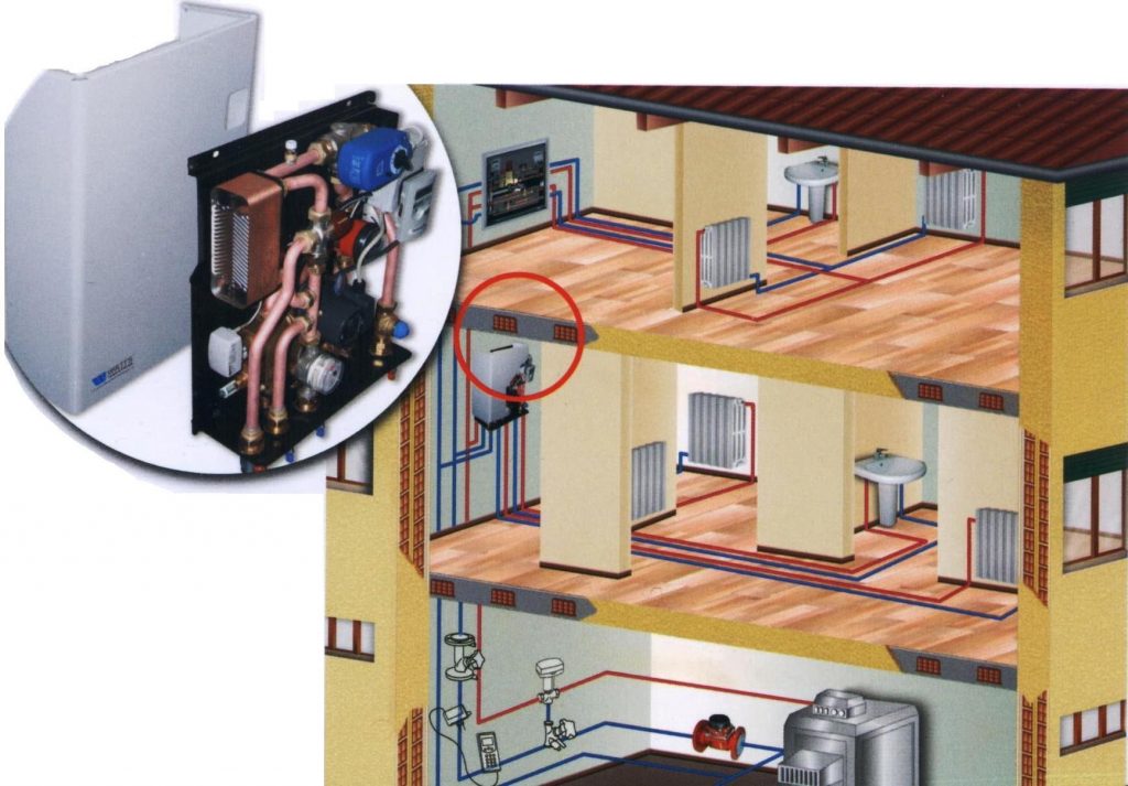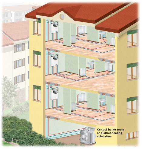 – واحدهاي گرمايي مي توانند نزديک ساختمان ها يا داخل واحد آپارتماني نصب شوند. (البته مناسب تر است در قسمتهاي عمومي ساختمان نصب شوند تا دسترسي سريعتر و آسان مسئول تاسيسات امکانپذير باشد.)