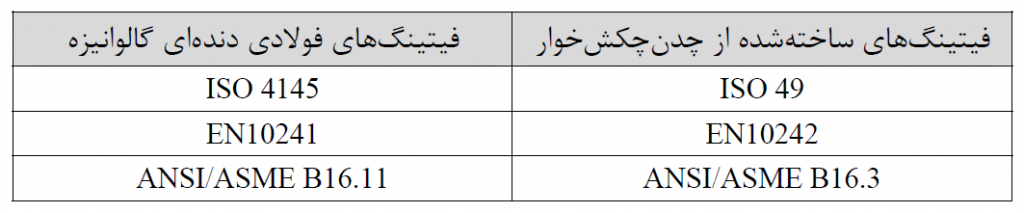 اتصالات مورد استفاده در لوله کشی فولادی گالوانیزه باید از نوع چدنی چکش خوار یا فولادی دنده ای گالوانیزه و طبق یکی از استانداردهای زیر باشد: